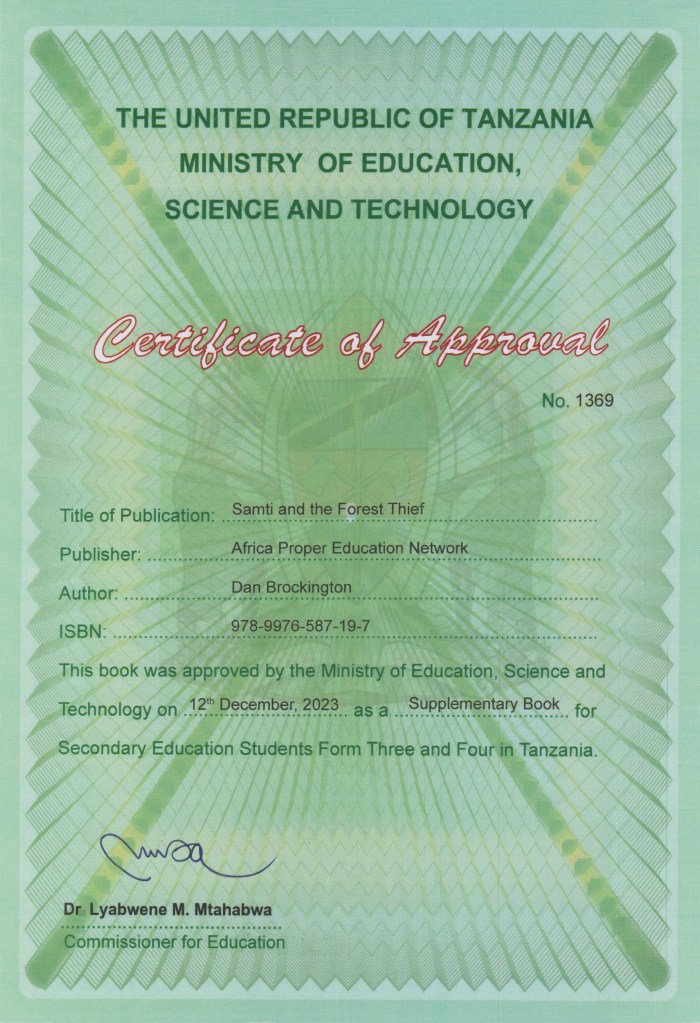 Samti and the Forest Thief has been approved by the Tanzanian Ministry of Education, Science and Technology for use as a supplementary text in secondary schools, certificate number 1369, available here.