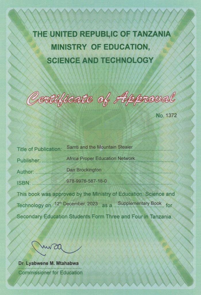 Samti and the Mountain Stealer has been approved by the Tanzanian Ministry of Education, Science and Technology for use as a supplementary text in secondary schools, certificate number 1372, available here.
